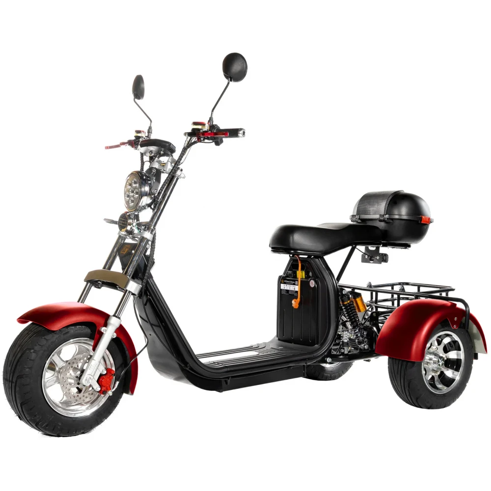 Электроскутер трехколесный Citycoco GT X11 Trike красного цвета - это уникальный и стильный способ передвижения, который сочетает в себе высокую мощность и комфорт. Он является инновационным транспортным средством для передвижения по улицам города и позволяет наслаждаться абсолютной свободой безопасного и экологически чистого передвижения.