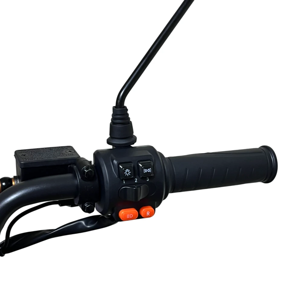 Мощность двигателя 1500 Вт обеспечивает разгон до 60–70 км/ч, справляясь с подъемами до 20° даже при полной нагрузке (150–160 кг), но на неровностях или с пассажиром запас хода падает до 50–70 км. Двухподвесная система (передняя вилка + задние амортизаторы) гасит вибрации на асфальте и гравии; дисковые гидравлические тормоза останавливают за 3–5 м со 50 км/ч; Li-ion аккумулятор 60V 50 Ач с быстрой зарядкой за 8 ч дает реальный пробег 70–100 км в эко-режиме, 50 км в спорте. Три режима езды + задний ход оптимизируют энергоэффективность (эко экономит 20–30% заряда), мотоциклетная ручка газа упрощает контроль; подвеска и задний привод повышают эффективность на 10–15% по сравнению с передним.