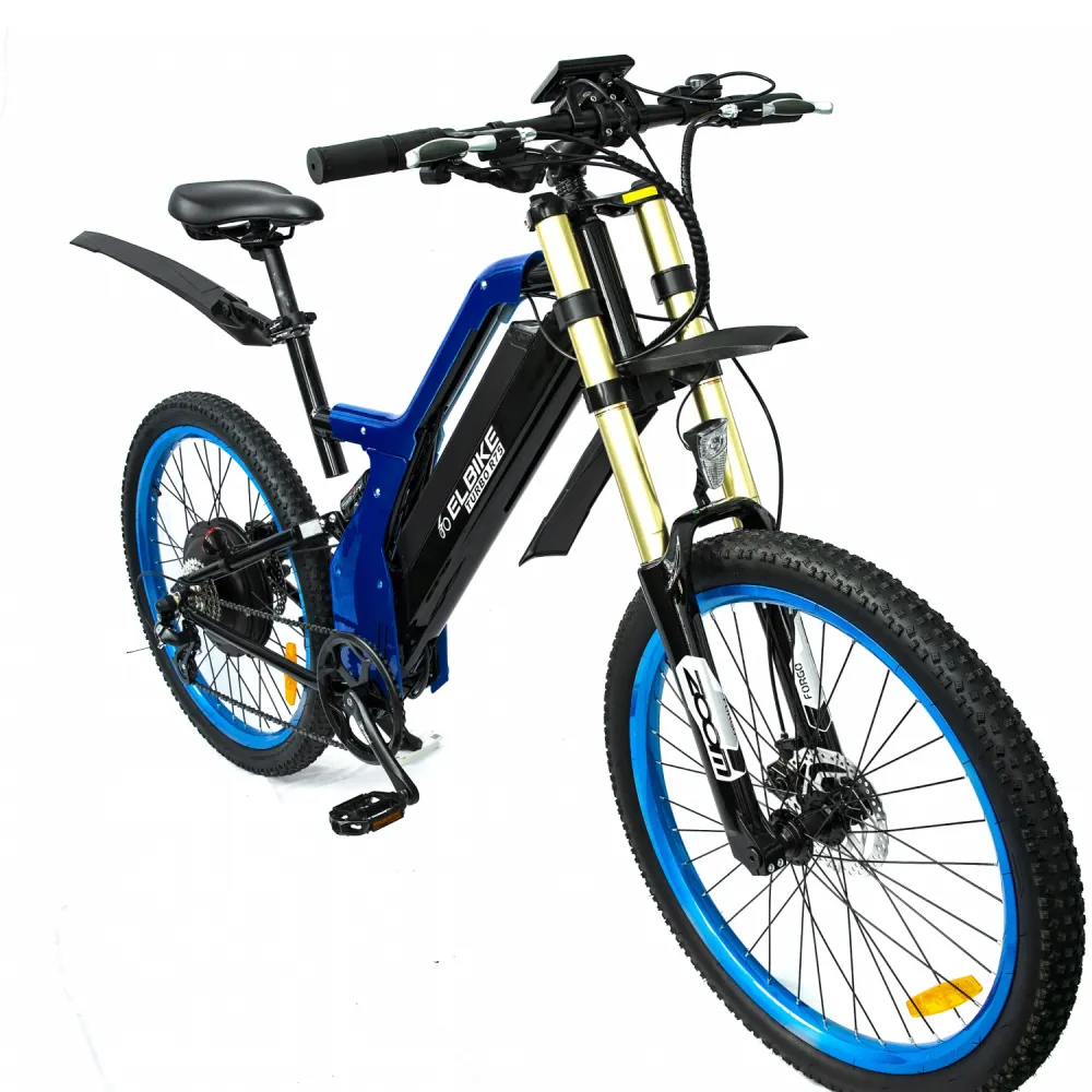 Электровелосипед Elbike TURBO R65 премиум класса представлен в благородном синем цвете. Мощный мотор 500 Вт, большой размер колёс в 26 дюймов, электровелосипед разгоняется до 40 км/ч.