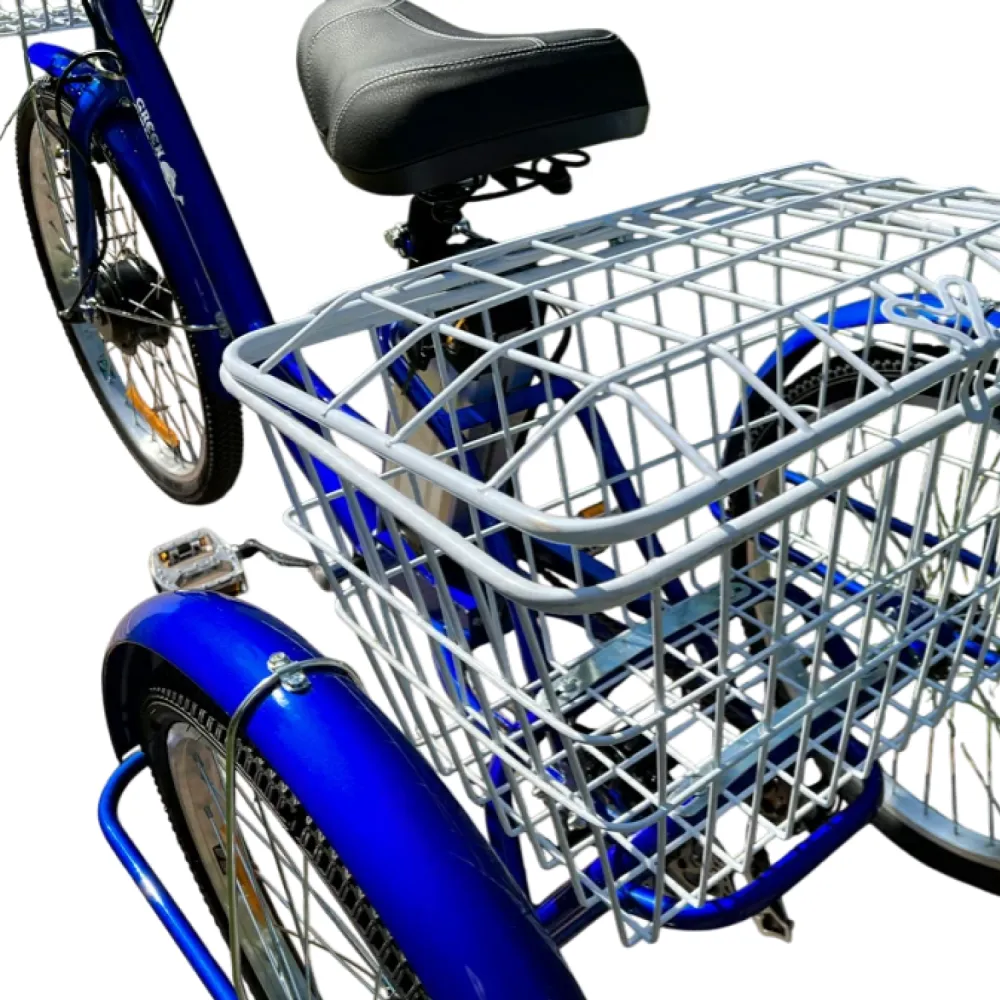 GreenCamel Трайк-24 V3 — трёхколёсный электровелосипед-трицикл для стабильных городских поездок, доставки или отдыха. Низкий центр тяжести обеспечивает устойчивость, максимальная скорость 25 км/ч, нагрузка 150 кг, пробег до 40 км. Идеален для тех, кто ценит безопасность и простоту.