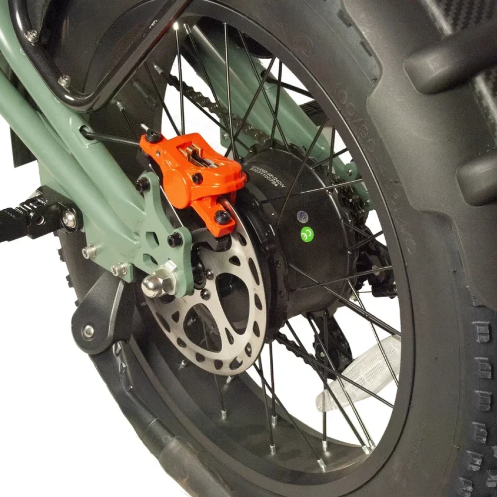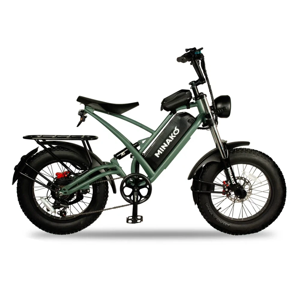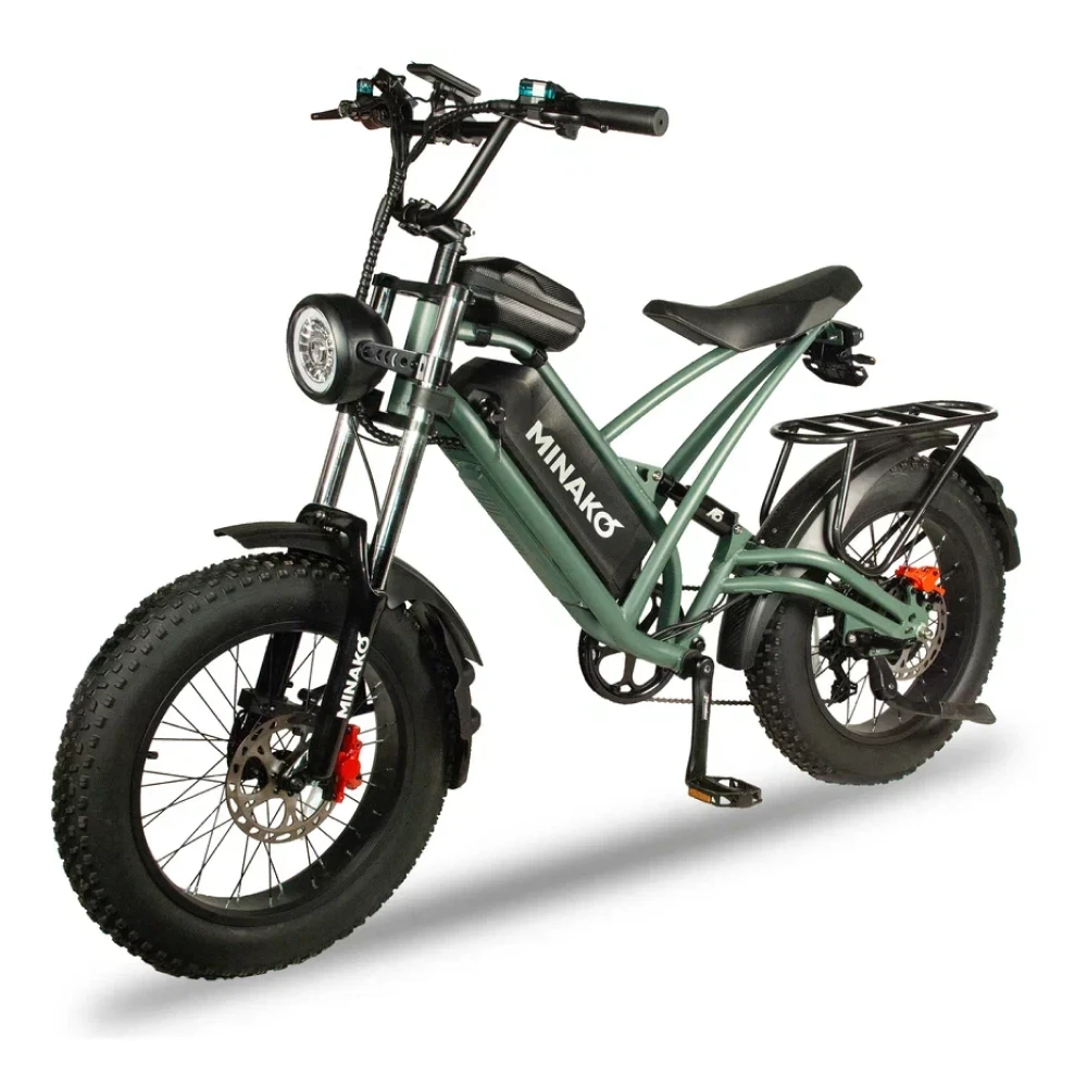 Электровелосипед Minako FOX (23Ah) в оливковом цвете - это сочетание мощности, стиля и удобства. С его 1000W двигателем, вы можете достичь максимальной скорости 55 км/ч, а 23 Ah аккумулятор обеспечивает пробег до 60 км на одном заряде. Уникальный дизайн, напоминающий питбайк, и мотоциклетная вилка подчеркивают его агрессивный вид. Большие внедорожные покрышки и гидравлические дисковые тормоза обеспечивают безопасность и уверенность на дороге. Багажник сзади, который можно использовать как место для пассажира, небольшая сумка спереди и стоп-сигнал делают его еще более удобным. Помимо переднего мотоциклетного амортизатора, есть еще и задний велосипедный амортизатор закрытого типа, обеспечивающий комфортную езду.