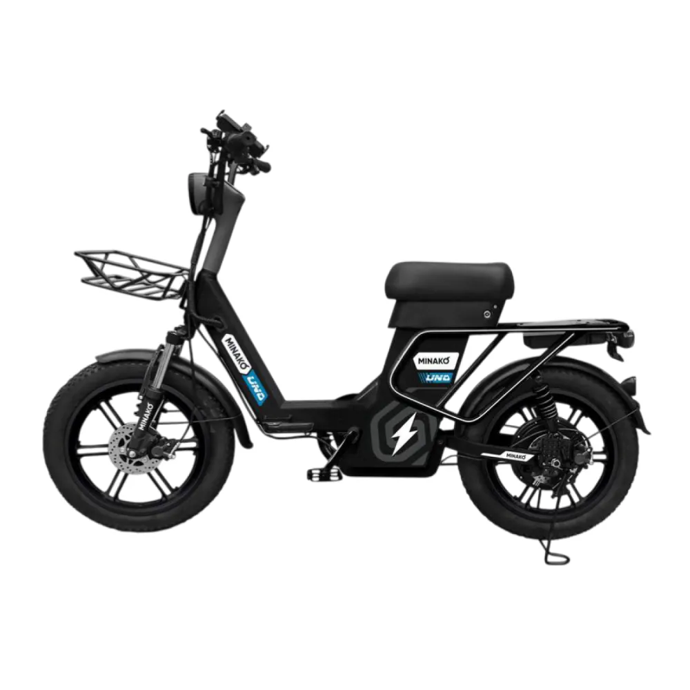 Электровелосипед Minako UNO 21Ah — надёжный городской вариант с мотором, пробегом до 80 км и грузоподъёмностью 180 кг. Он сочетает комфорт амортизаторов, гидравлику и аксессуары для повседневных поездок.