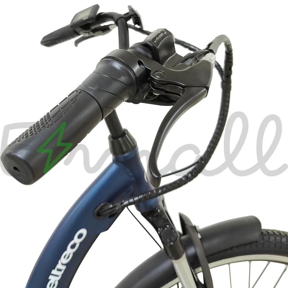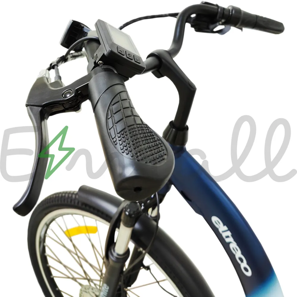 Рама изделия усовершенствована. Стала максимально легкой благодаря изящному алюминию. Рулевая часть велогибрида оснащена LCD-велокомпьютером Eltreco M3, благодаря которому удобно отслеживать скоростные характеристики, заряд АКБ и другие параметры.
