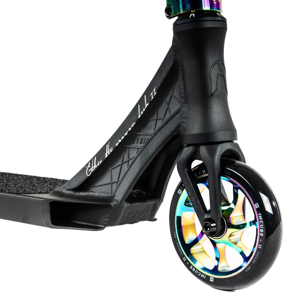 Ethic Erawan V2 (S) neochrome — это не просто трюковой самокат, а настоящее произведение искусства в мире экстрима. Сочетание строгих черных тонов с яркими дисками и хомутом в градиентном цветовом исполнении с эффектом бензина создает уникальный стиль, который привлекает внимание и подчеркивает индивидуальность райдера. Этот самокат весит всего 2.79 кг, что делает его невероятно легким и удобным для выполнения трюков любой сложности.Колеса диаметром 110 мм и высококачественные подшипники класса ABEC 9 обеспечивают плавность и стабильность движения, позволяя райдеру полностью сосредоточиться на выполнении трюков.