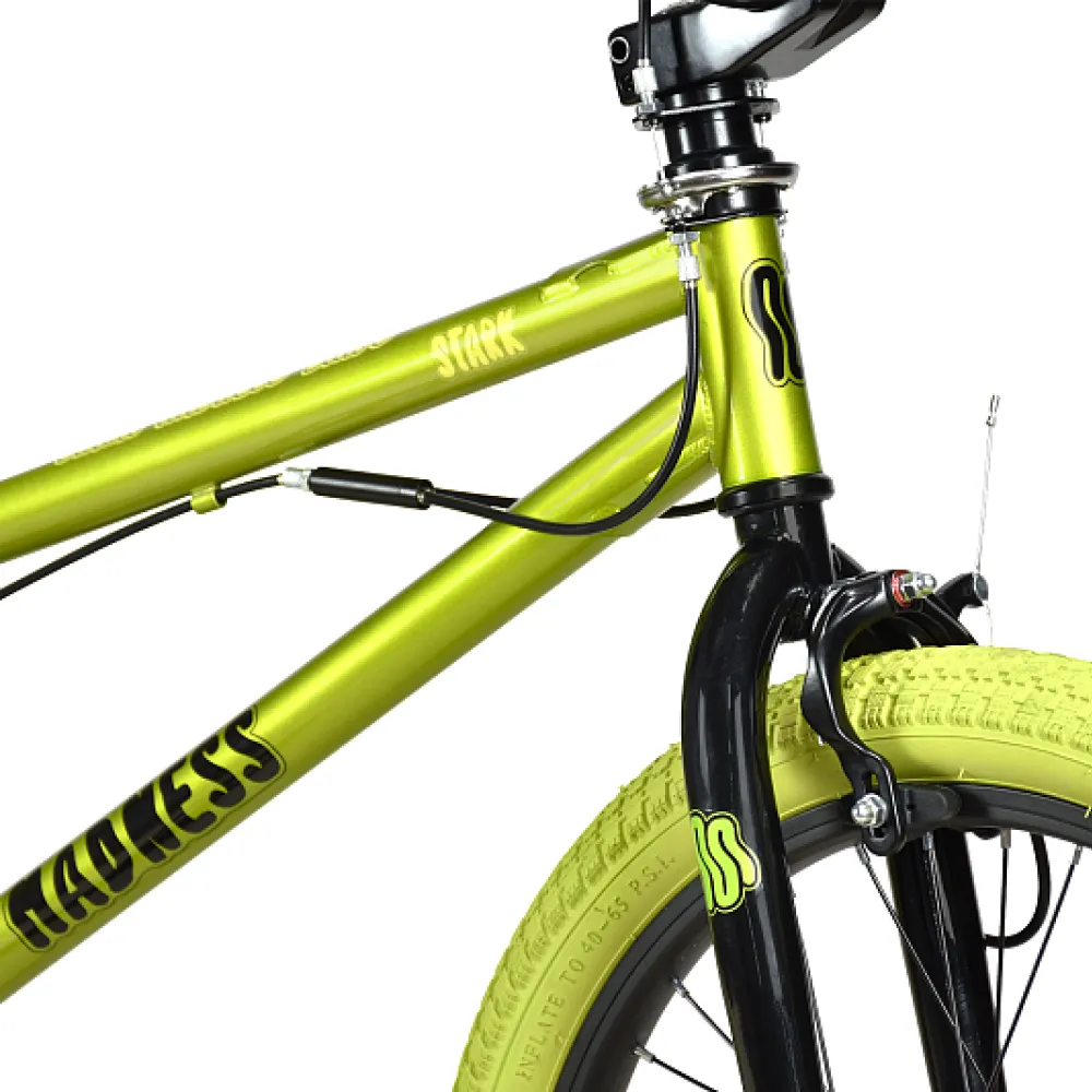 BMX велосипед Stark Madness 3 2024 года выделяется своим оригинальным зеленым металлик цветом рамы и зелеными хаки покрышками. Стальная рама Hi-Ten 13A весом 14,3 кг и размером 9 дюймов совмещает в себе прочность и легкость. Ободные клещевые тормоза Sparkle U-969D и жесткая вилка Stark Rigid обеспечивают безопасность и уверенность на трассе, а 20-дюймовые колеса подчеркивают экстремальный стиль. Резиновые грипсы XHH XHG117 и стальной руль Intek ITC-6665 гарантируют комфорт при каждой поездке. Седло Aerj A-6609 и цепь KMC Z-410 обеспечивают надежность в использовании. Втулки Kung Teng AJ9R/KT135F подчеркивают эстетику этого BMX велосипеда, делая его незаменимым для любителей экстремального катания.